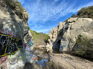 Safer at home, saner after a nature hike—still an approved activity. Thanks to Charles Fleming's December 20, 2019 post in the L.A. Times, Barbara and I avoided the usual hiking hot spots and took this charming (with a touch of weird) hike to one of L.A. County's occult magnets. The trail, heading north, begins at the intersection of Washington Boulevard and West Drive in Pasadena and parallels the West side of the Brookside Golf Course. A delightful stroll under oaks and pepper trees, with geese and parrots yakking as they flew overhead, the golf course was green as spring and empty. The path so very quiet you could hear the bees. Past the golf course, the trail took us to the "brook" of Brookside, a rocky stream we hopped over twice, balancing on rocks and log crossings with dry-shoe-success. Passing beneath the towering arches of the 210 freeway overpass, we hiked the sandy banks of the brook to Devil's Gate, our notorious destination. The rock formation, named for its profile of Satan, carries a sinister spiritual reputation. The Tongvas claimed the laughing sound of the rapids passing through the gorge came from the coyote spirit. In the 1940s, occultists like Aleister Crowley were convinced the gorge was one of the seven portals of hell. Contemporary graffiti artists use the rocks as a canvas. Barbara and I had no interest in discerning Satan's profile that gave the formation its name—life is weird enough right now without seeking out spooks—but we did stop to take in the rocks and cave entrance leading to the Devil's Gate Dam upstream, part of the Arroyo Seco flood control scheme. We crossed the brook again to follow a path that led us to the trail bordering the East side of the golf course and back to the car. Social distancing was no problem at all. At best, we met ten hikers/dog walkers on the entire trail. This hike is an excellent alternative to the stream of joggers circling the Rose Bowl. Just the distraction, fresh air, and challenge we needed to refuel our spirits. Be safe, be well, and be kind, everyone.